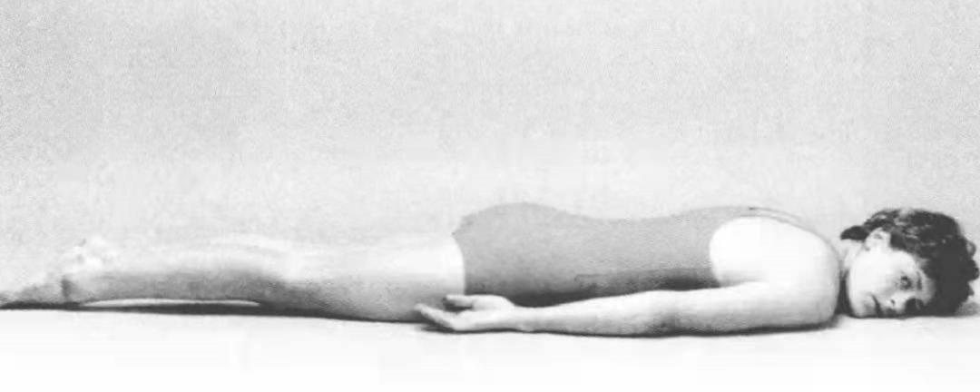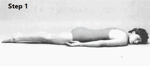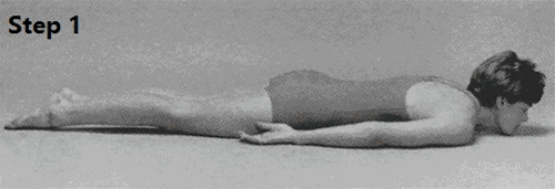 Step 1:身体俯卧平躺,双臂放在身体两侧,保持伸直和放松,头转向一侧;