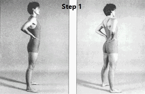 Step 1:两脚分开站直,双手放在后腰部,四指靠在脊椎两侧;