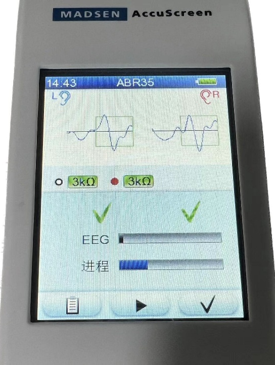 吴女士根据指示来到了听力室,听力师对宝宝进行了耳声发射(OAE)和自动听性脑干检查(AABR),幸运的是,这次两项检查均通过了!