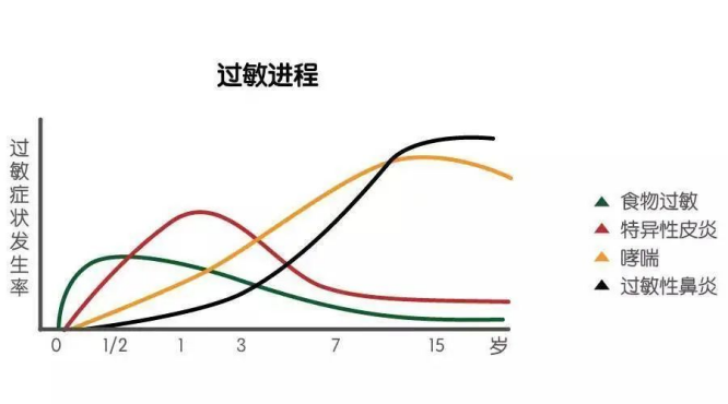流行病学研究发现,各类过敏性疾病的出现呈现出从儿童湿疹、食物过敏逐渐向过敏性鼻炎、过敏性哮喘发展的过程,这就是医学上的“过敏进程”。