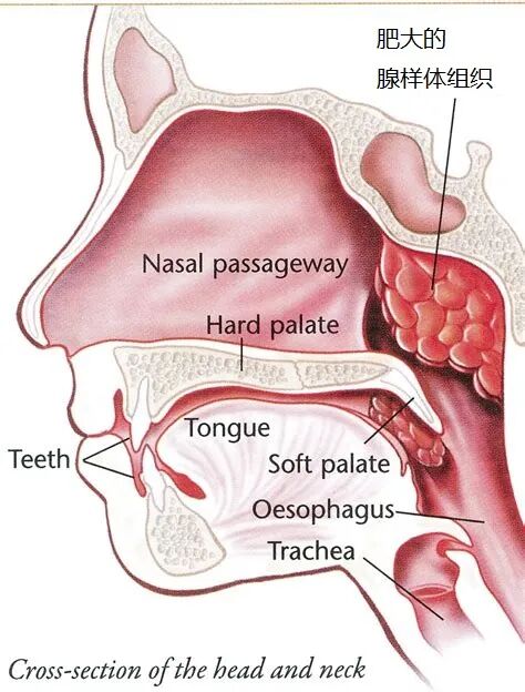 腺样体,又称咽扁桃体,是位于鼻咽部粘膜内聚集的淋巴组织,在后鼻孔的后方。