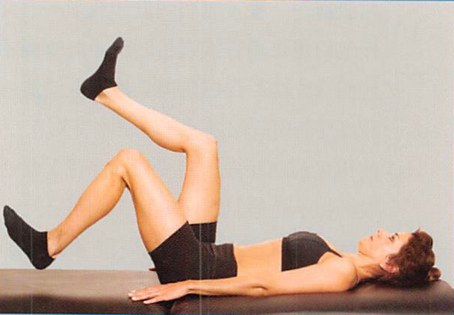 动作要领:配合呼吸并将腹部肌群收紧,腰贴紧床面,呼气伸直一侧下肢,吸气将同侧下肢屈曲回原位,双侧交替进行。