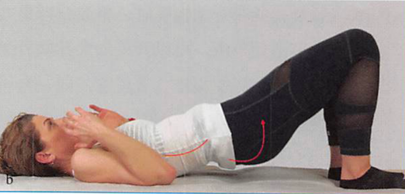 动作要领:配合呼吸腹部肌群收紧,从尾骨逐节抬高至腰椎,再从腰椎逐节向下还原。