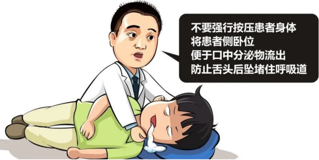 如果出现肌肉不自主抽搐,应避免被伤到自己。意识不清的时候不要试图给患者喂水,如果患者有呕吐不适,应及时使患者侧躺,或将头扭向一侧,避免误吸到肺里。