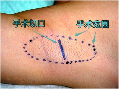 在腋中或腋后做1个3-4cm小切口,把皮下的汗腺刮除和剪除,保留皮肤。