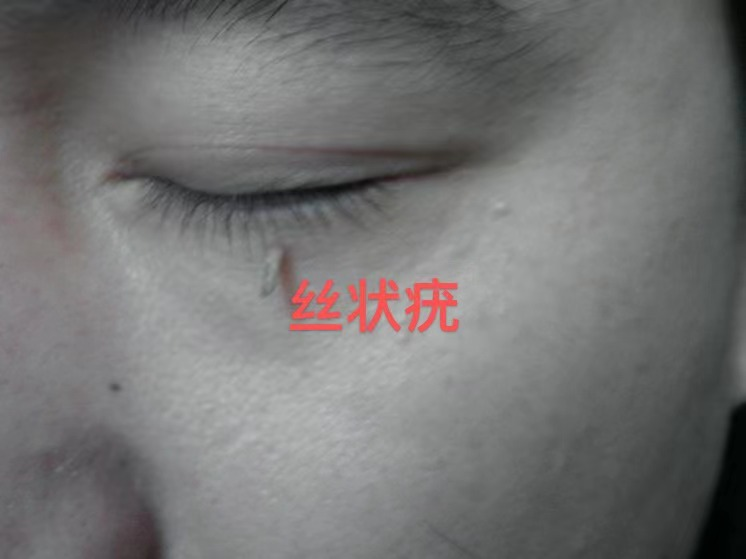 好发于颈部、额头、眼睑(即眼皮)等处,表现为细长的丝状突起,常伴有顶端角化。