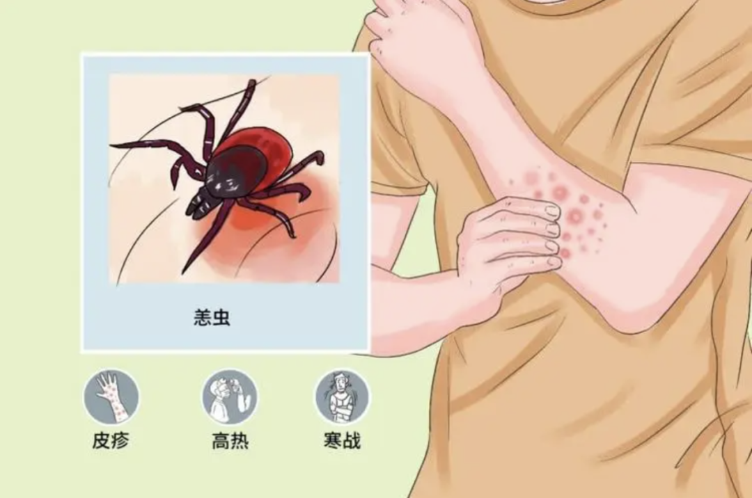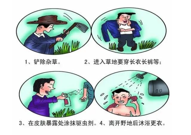 ➋ 在野外或公园最好不进入草丛,不要坐卧在草地上;回到家及时拍打衣物,换衣洗澡,检查腋窝、腹股沟等部位,发现异常及疑似症及时就医,平时避免在草地上晾晒衣被。