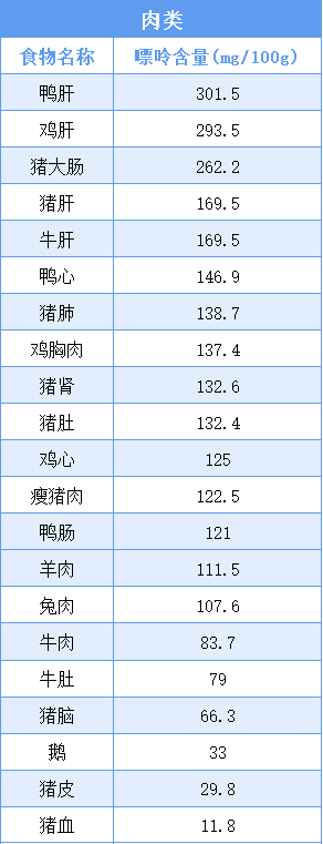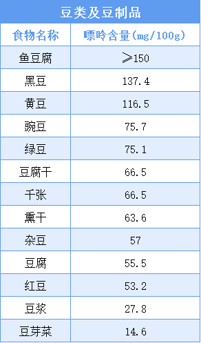 下面图表里可明确看出肉类及豆类食物里含嘌呤的含量: