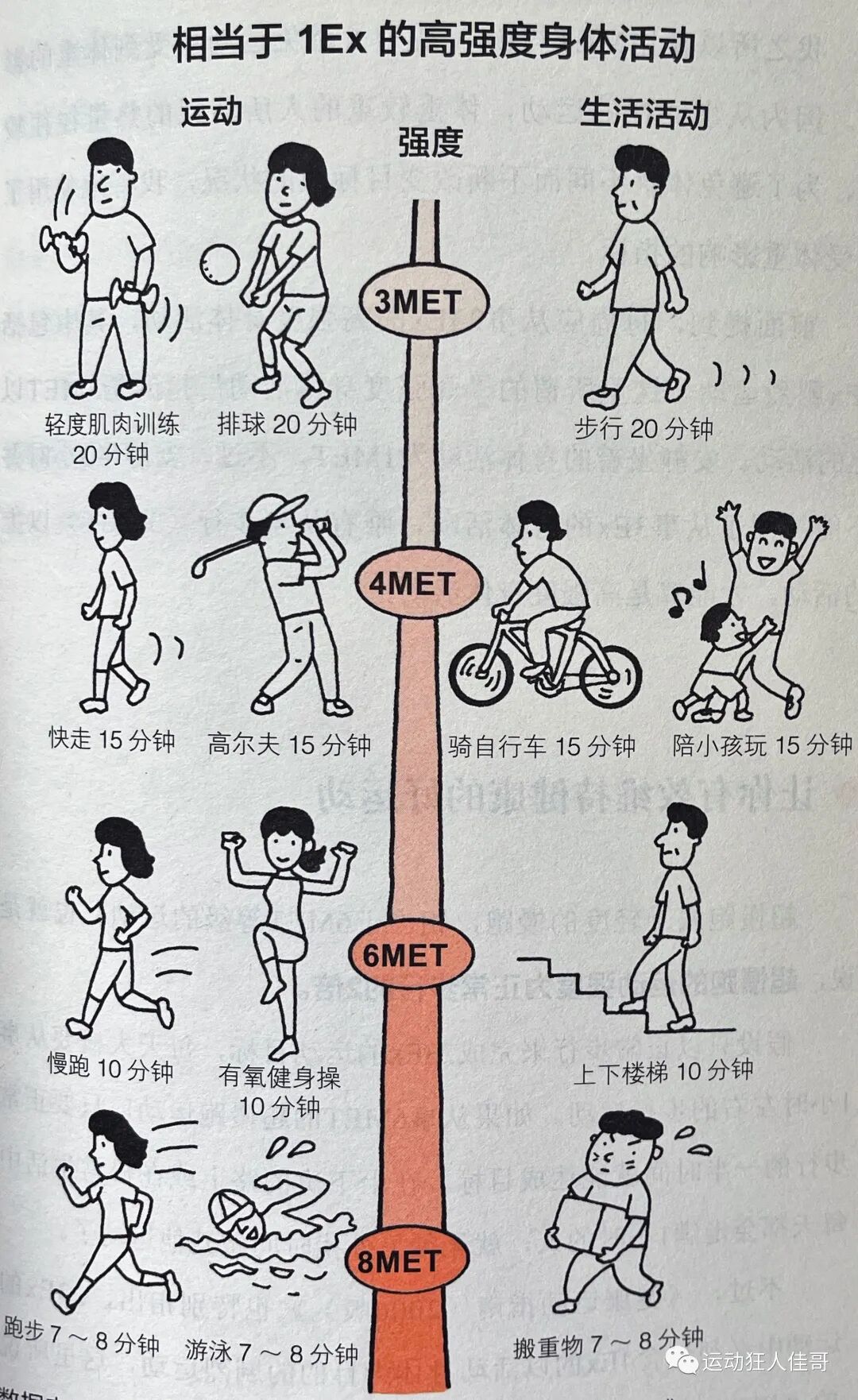 代谢当量(metabolic equivalents,MET)是指运动时的热量消耗与安静不动时热量消耗间的比值,想要维持健康,每周必须要进行23Ex(EX表示进行1MET活动1小时的运动量)的高强度身体活动(运动、生活活动),其中需要包含4Ex剧烈运动《健康运动指南》。