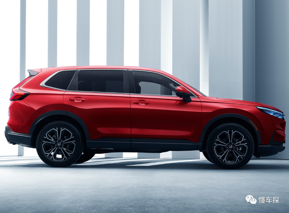由于车身尺寸进行了加长,2023款本田CR-V的侧面看着更加高大魁梧,上腰线连接了前后车灯,使车身显得更舒展。