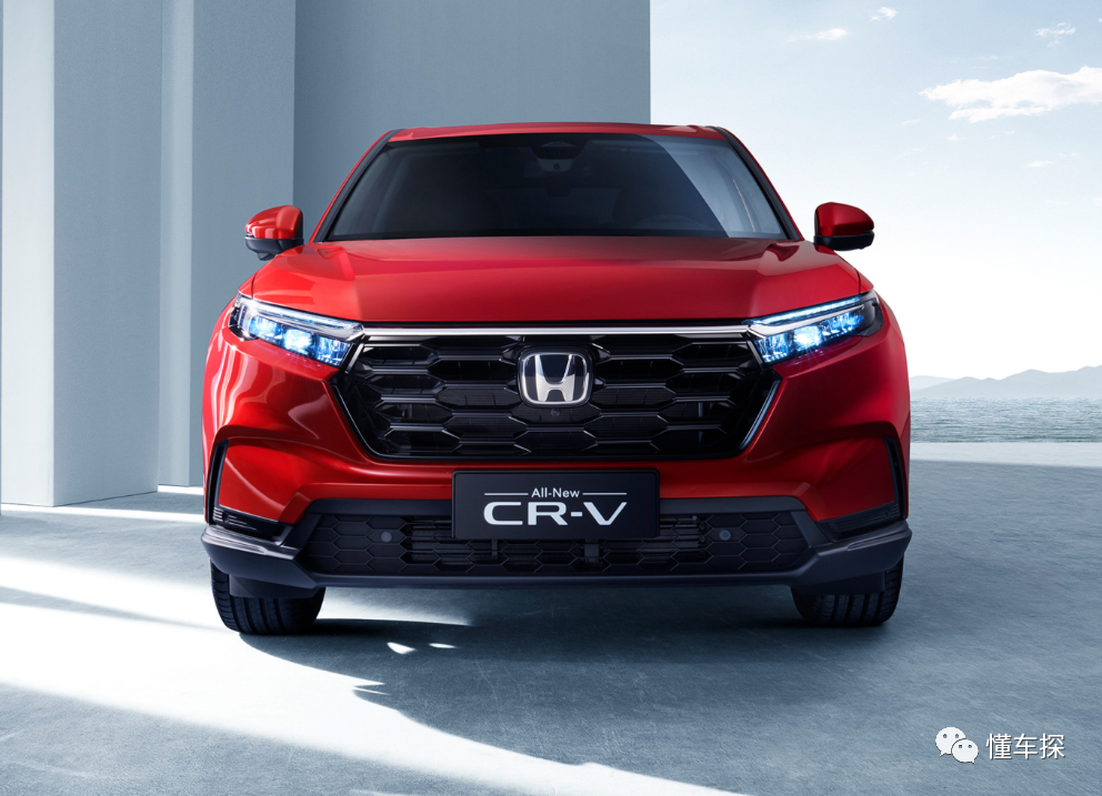 2023款本田CR-V最大的变化就是它的外观,新车终于摆脱了本田汽车“套娃式”的设计,取消了中网上标志性的银色镀铬饰条,用黑色的蜂窝状中网进行填充,配合犀利的大灯组,营造出了简约但有气场的前脸。