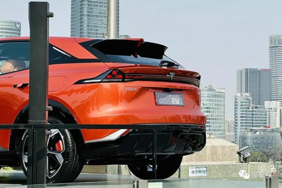 从视觉来看,深蓝S7有一种轿跑车的质感,修长的引擎舱不光是在结构上接近于轿跑式SUV,更被添入了组合式扰流板以增大车头下压力。