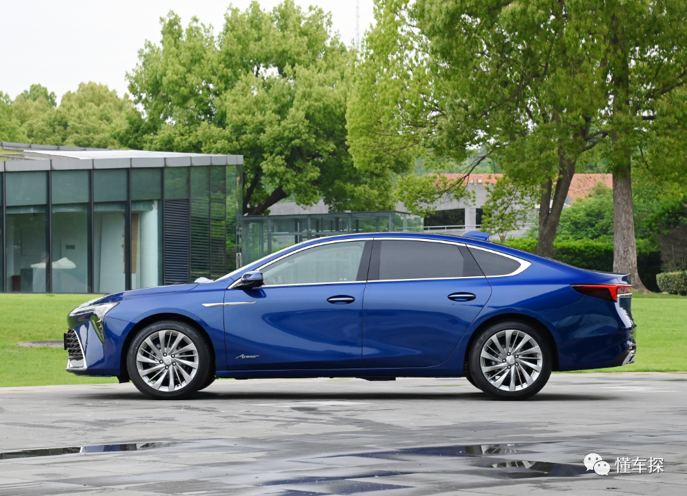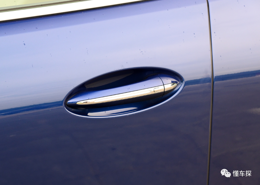 车门把手虽然不是隐藏式设计,但是门把手很纤细,看起来也有比较强的精致感,轮毂尺寸最大为19英寸,保证了侧身的气场。