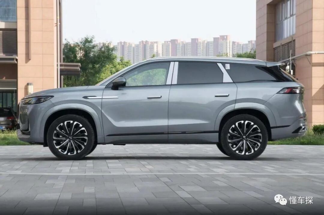 车侧则是一副标准的SUV车身,车顶从A柱末端就开始逐步下沉,使得车尾整体形成了夹紧效果,尾窗都采用了隐私玻璃,提升了后排乘客的私密性,分段式的腰线均保持平直,主要对前后轮拱区域上方进行了勾勒,同时轮拱区域也单独加入了凹痕型面的搭配,从前轮拱延伸出一根裙线,从翼子板处下降后就保持平直走向,将车门下方的立体型面展现得更为全面。