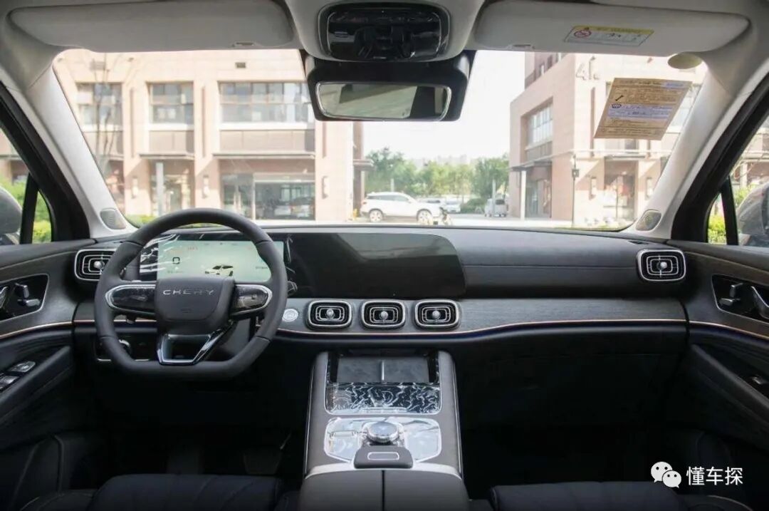 走进车内,全新瑞虎9融入了更多时尚的科技化元素,让整车内饰呈现出更强的现代气息,中控台整体拥有明显的分层式处理,上方的台面采用了软性材质进行包覆,出风口整体采用了方形套娃涡扇式结构,在镀铬饰条的装饰下更有质感,台面中央则配有一块梯形轮廓的双联屏,集成了车内几乎所有的调节功能,因此实体按键数量大幅减少。