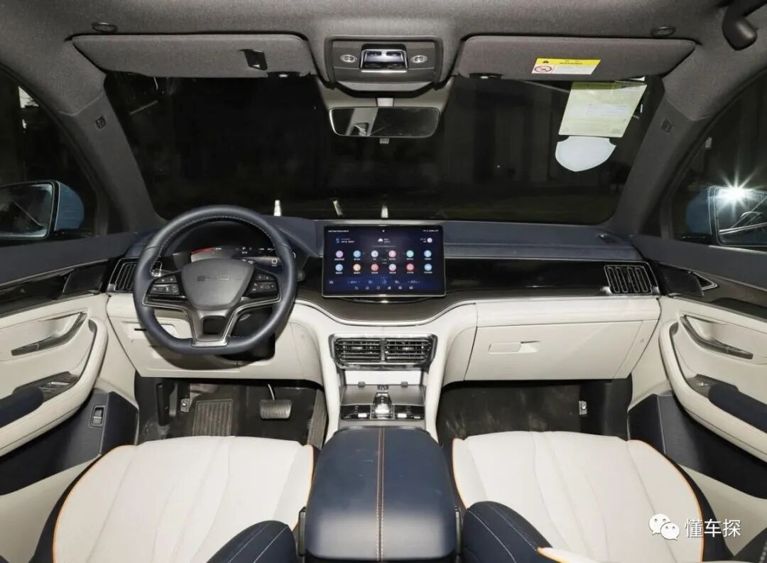 走进宋PLUS冠军版的车内,整体的座舱布局与老款车型变化不太大,只在细节处进行了全新设计,例如方向盘上的汉字“宋”已被换为了“BYD”标识,副仪表台区域也进行了重新设计,标准的T型中控台采用了深浅的配色处理,台面也采用了软性面料进行包覆,前侧的饰板采用了烤漆材质,并在边角处加入了镀铬饰条进行装饰,此外,新款车型依然配备了15.6英寸或12.8英寸的自适应悬浮中控屏,科技感依然保持。