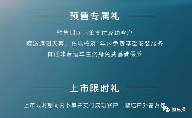 Hi4-T一同出现的,还有一些关于新车的相关权益,权益中表示,在预售期间下单支付成功的客户,将会赠送遮阳天幕和充电桩以及1年内免费基础安装服务,同时首任非营运车主终身免费基础保养,而在上市期间内下单并且支付成功的客户,官方还将赠送户外露营包,再加上六大无忧礼,感兴趣的朋友不妨去关注一下。