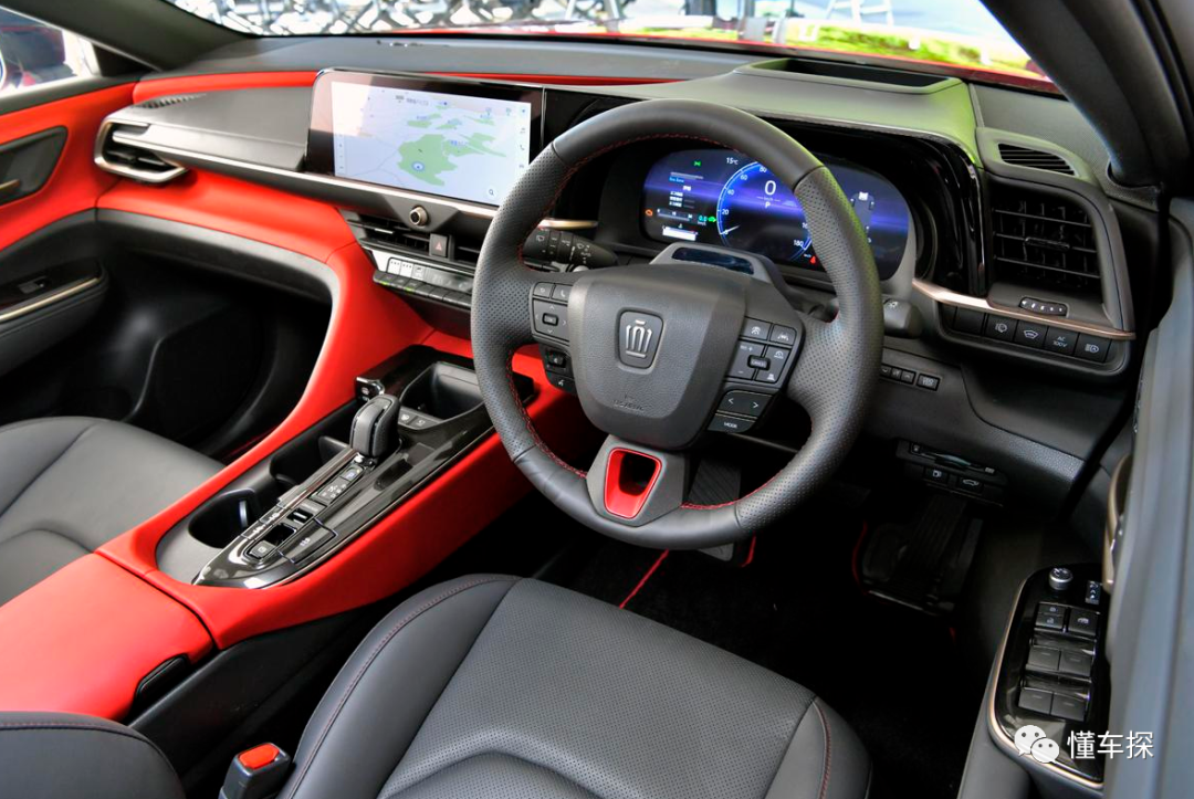 方向盘前方是全液晶仪表盘,仪表盘边缘还通过黑色镜面饰条连接了悬浮式的中控屏幕,提升了座舱内部的科技感。