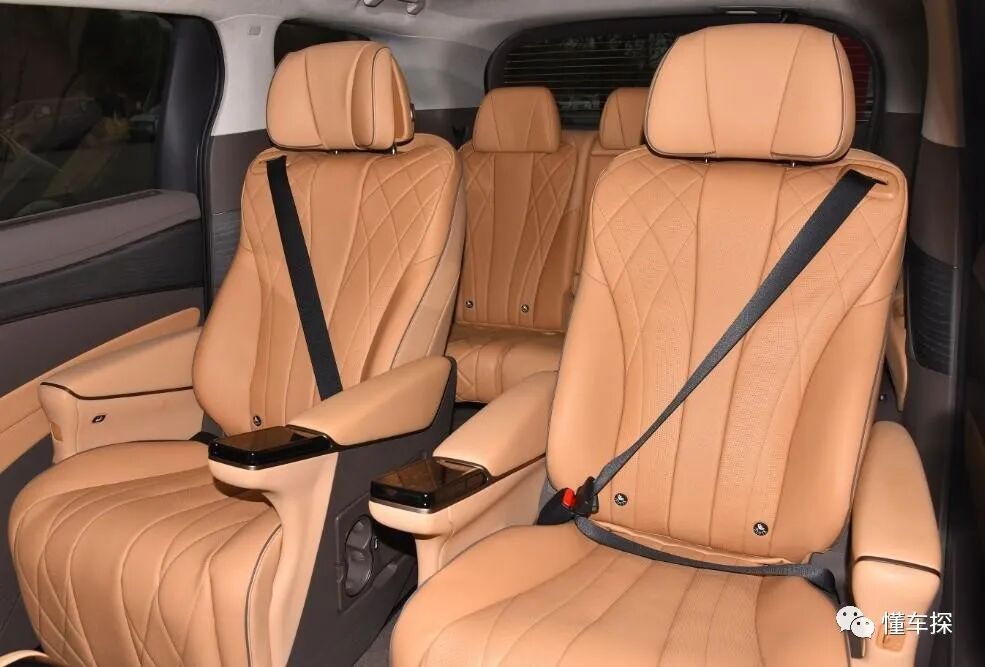 车辆座椅都采用了nappa材料,总体包裹宽大厚实,乘坐感受极为舒适,起码从座椅表现上,是完全能够符合一款商用MPV的定位的,尤其是第二排座椅更是可以达到零感体验。