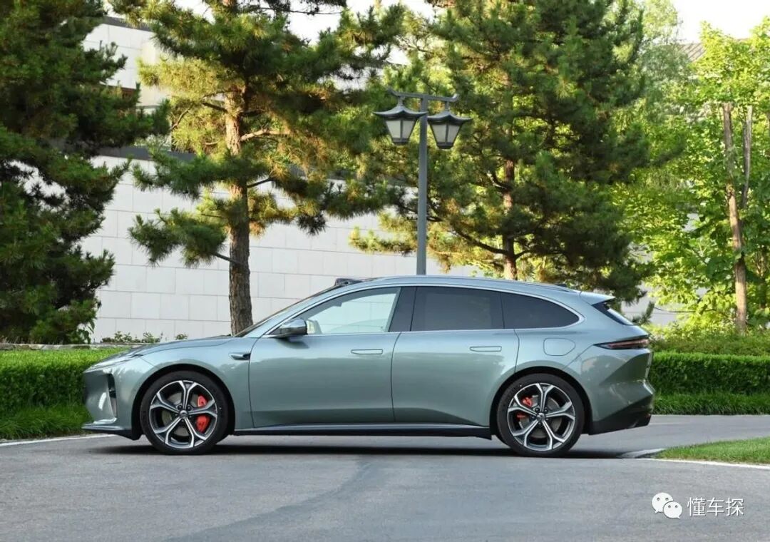 既然作为一款旅行车,它与普通三厢版主要的区别在于车尾部的设计,ET5旅行版拥有更为平直的车顶线条,但从B柱末端依然保持了一定弧度的下行,车窗线采用了镀铬饰条进行装饰,后排依然配有隐私玻璃以提升整体的私密性,腰身并没有使用过多锋利的线条组合,而是通过型面的起伏和凹凸增强了车身的肌肉感,隐藏式门把手配上无框车门的设计迎合了当前时尚的审美偏好,同时多辐式轮毂配上红色卡钳的设计也提升了运动气息。
