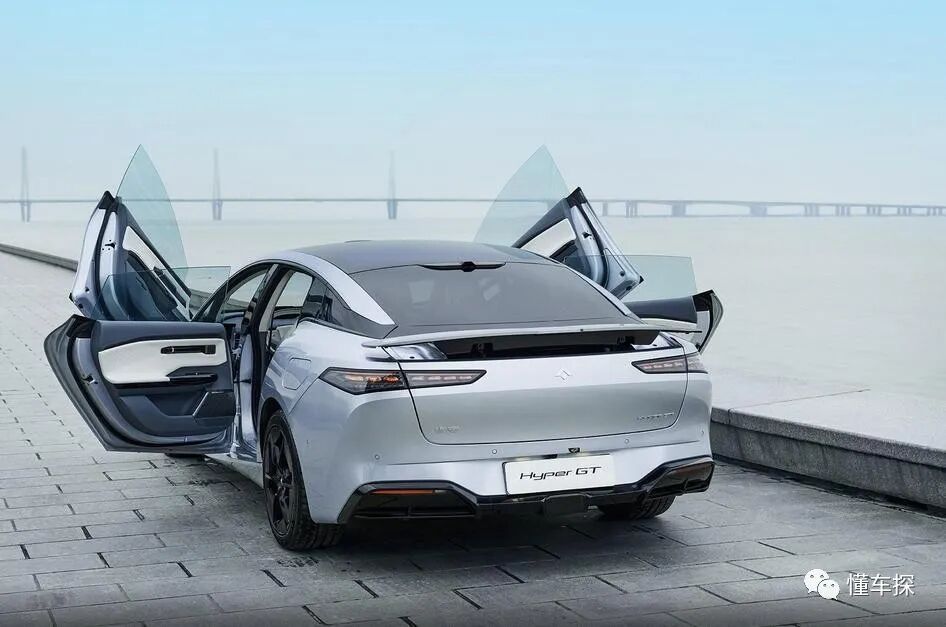 至于车尾处,昊铂GT的车尾造型其实很平庸,也很简洁,其尾灯造型相对比较狭长,中间还设计了埃安的英文标识,后包围也有空气扰流板,这些都很大程度上丰富了整车的层次感。