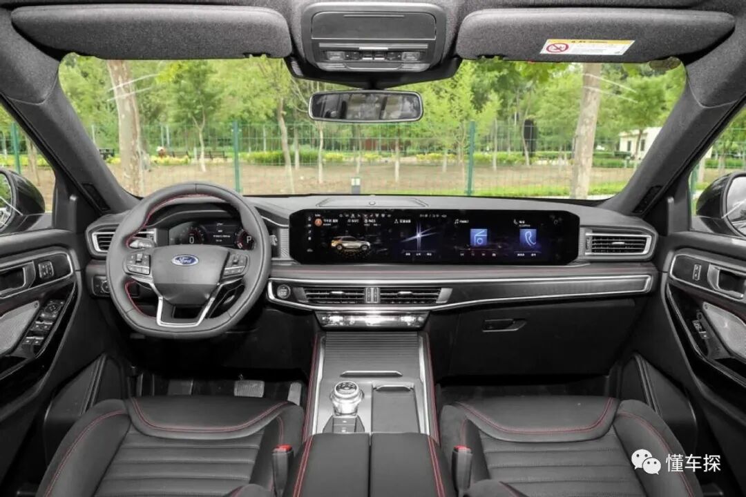 这个时候再进入车内,感受一下出色的科技氛围,要说福特探险者作为纯粹的美系SUV,此前可一直和科技无关,中期改款后开始配备全液晶仪表+中控双液晶联屏,尺寸都非常可观。