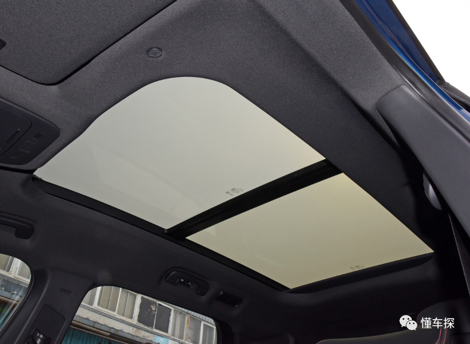 车辆还配备了一块面积比较大的全景天窗,它的长度为1230mm,宽度为700mm,透光面积能够达到0.86㎡,虽然这块车窗可以打开的面积仅为总面积的一半,但是对于车内氛围的提升也已经是足够了。