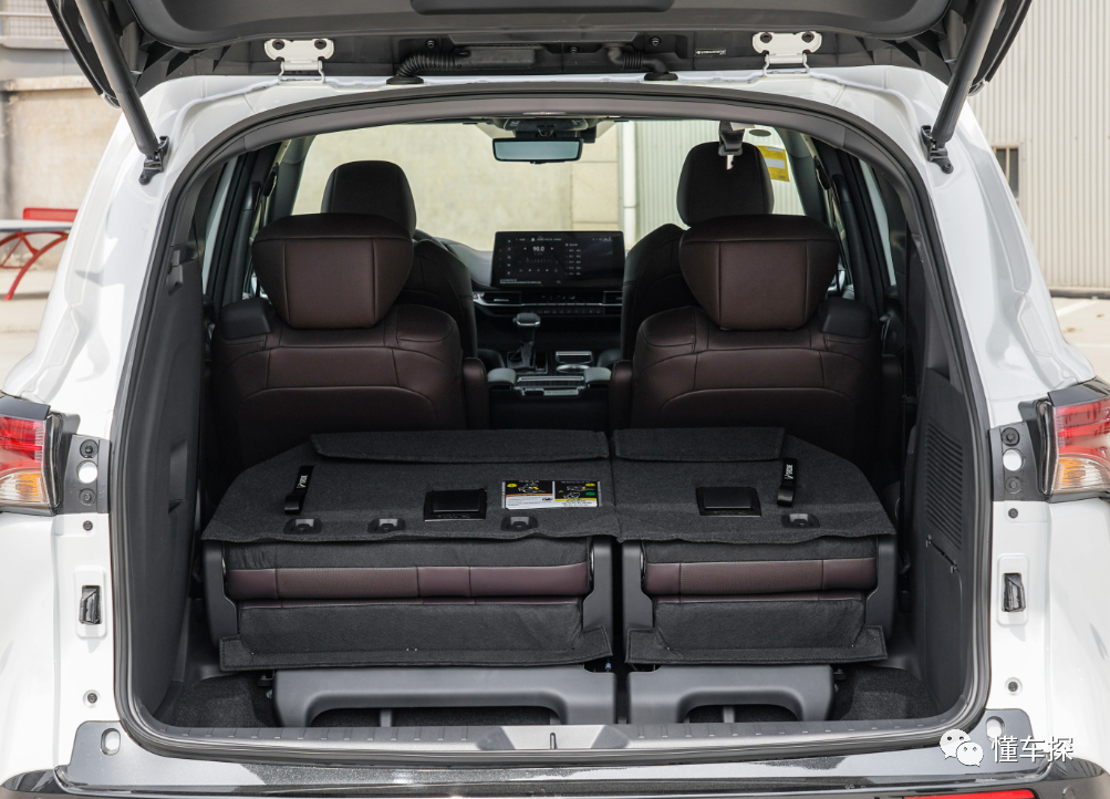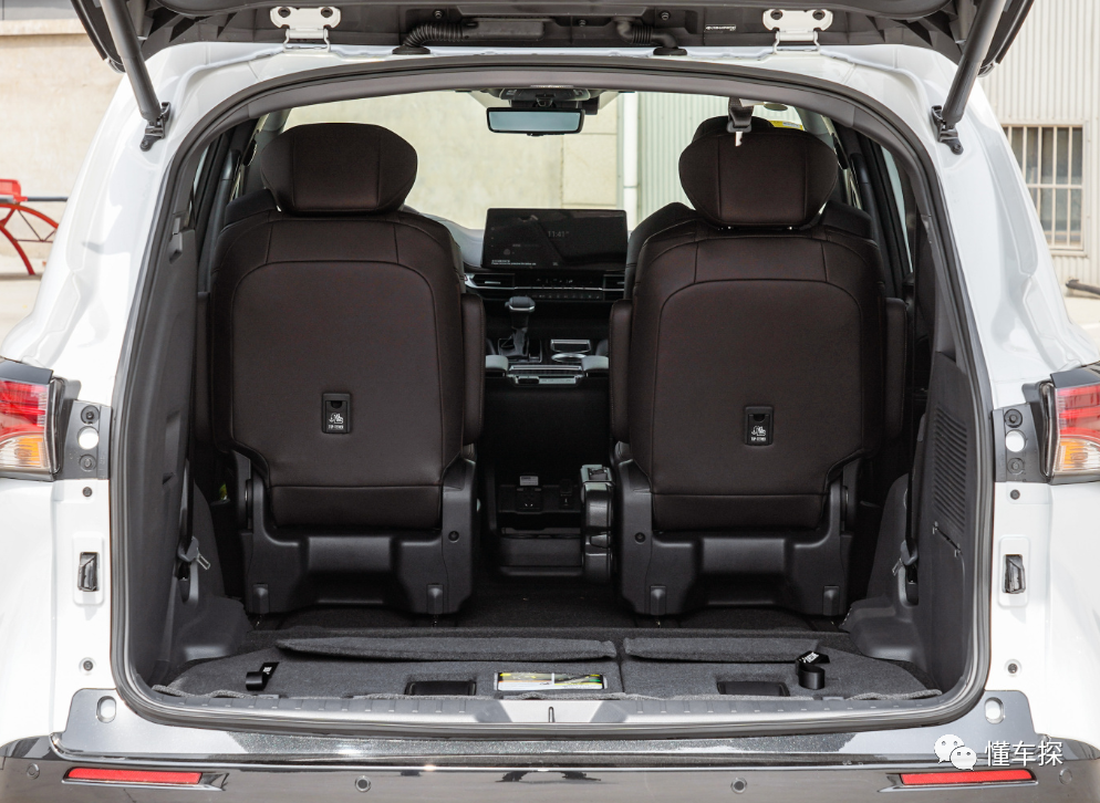 如果你有储物的需求,也可以将第三排的座椅放倒,第三排座椅能在放倒后隐藏在后备箱的地台下面,这也是大家常说的“魔术座椅”设计,后备箱容积可扩展至