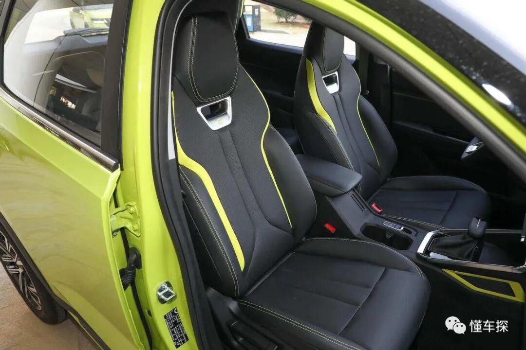进入到座舱之内,最先引起我们注意的不是中控台上的10.25英寸悬浮式触控大屏,也不是推杆造型的换挡机构,而是带有金属镂空与一体式头枕设计的全包围、运动风格座椅,同样是明亮的配色点缀,还有表面皮革完成的打孔工艺,呈现出色的视觉效果,同时提升了档次感。