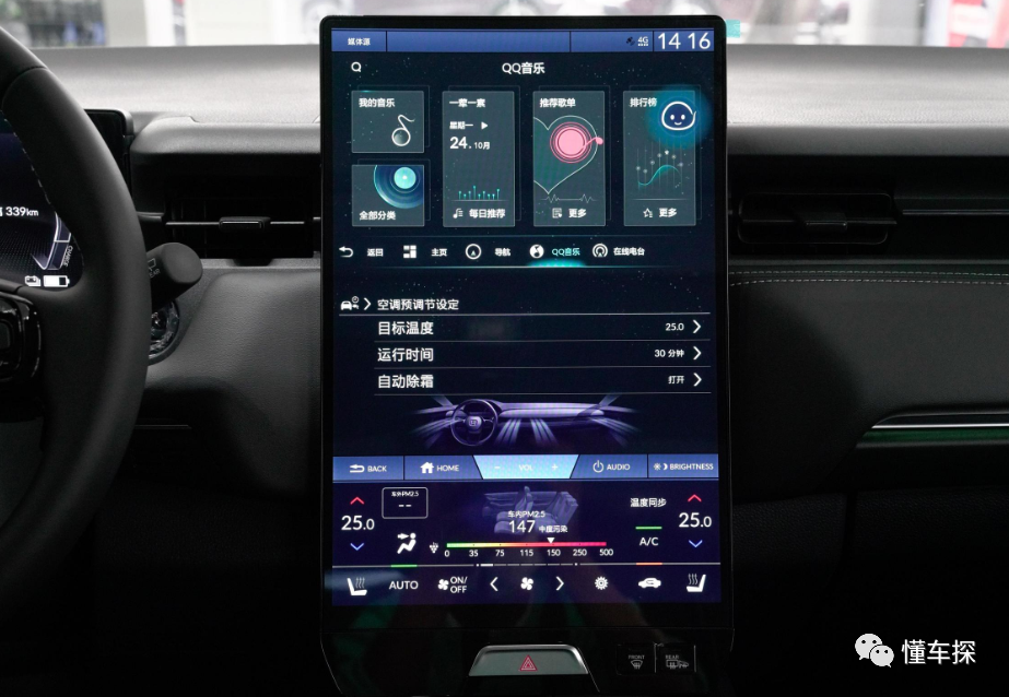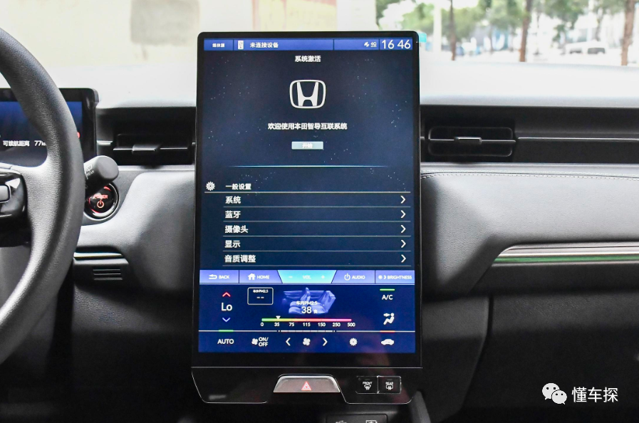 值得注意的是本田e:NP1极湃1的中控屏在使用过程中,可以分为上、中、下三个部分,最上部分可以显示导航/媒体等相关信息、中间部分可以选择设置的相关内容,最下方的部分则是空调部分,这种显示方式看起来挺方便,实际上我认为不如直接保留实体按键和旋钮更加方便。