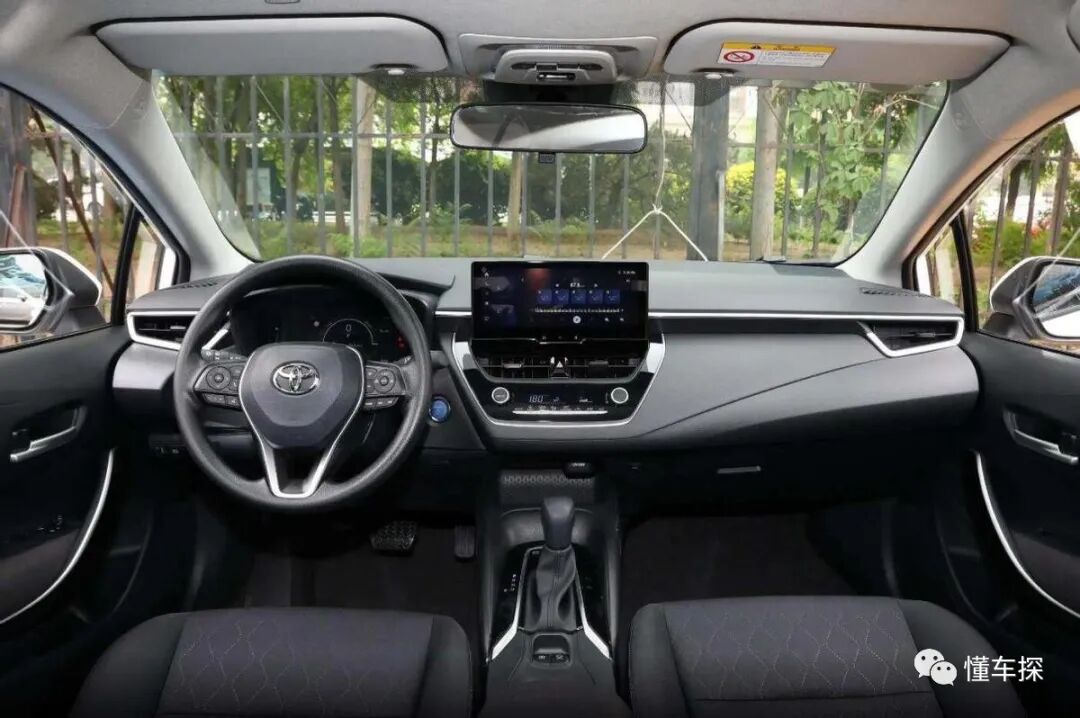 走进车内,全新卡罗拉的变化仍然较小,整体保持了简洁实用的风格,中控台采用了叠层化的设计,台面顶部保持了平整化布局,并且采用了软性材质进行覆盖,边角处加入了镀铬饰条进行封边,面向车内的台面则加入了流畅的线条走向勾勒,呼应了前脸的飞翼式元素,台面中间配有一块悬浮屏,下方排列着简洁的按键和旋钮搭配,高配车型还加入了液晶仪表,提升了车内的科技感。