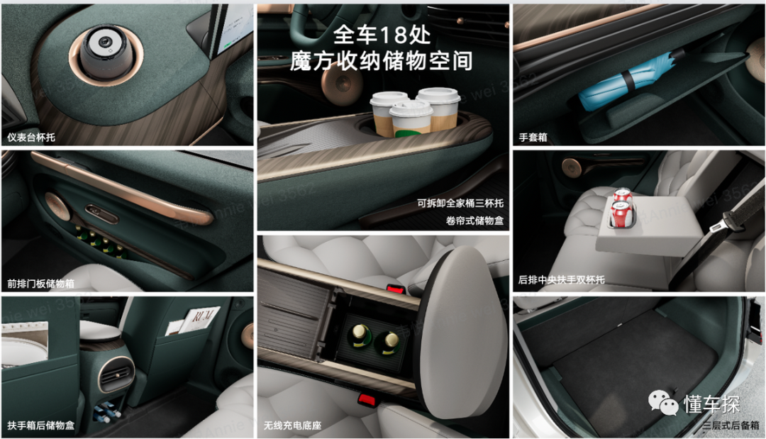 座舱内的储物空间也很丰富,全车提供包括手套箱、前后排门板储物箱、扶手箱后储物盒、卷帘式储物盒、储物袋在内的共18个储物空间,各种零碎物品上车后有地方放。