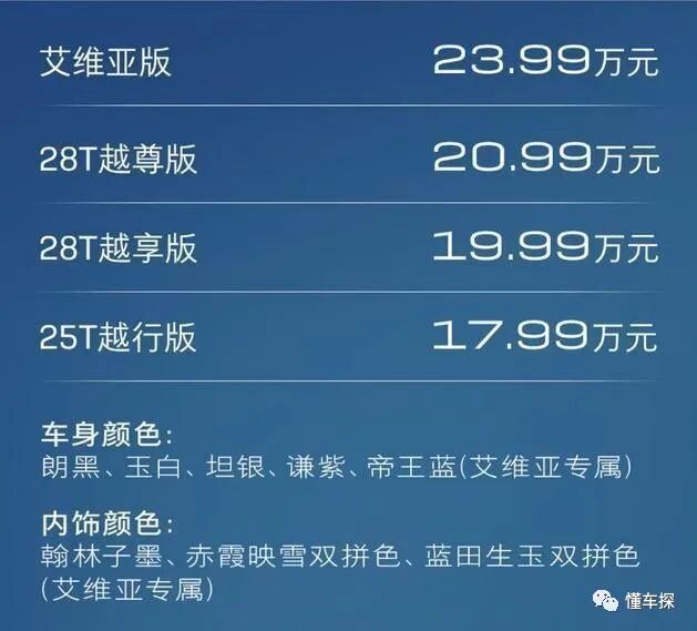此外,艾维亚版还可以选择专属的“帝王蓝”涂装,并有19英寸专属密幅式轮辋和普利司通 泰然者245/45 R19自修补轮胎配备。
