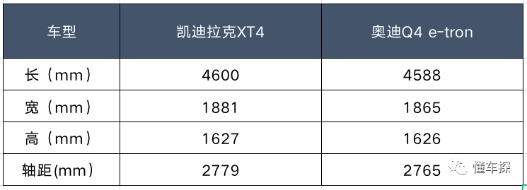 奥迪Q4 e-tron的车身尺寸全线落后于凯迪拉克XT4,轴距短了14mm,车长短了12mm。