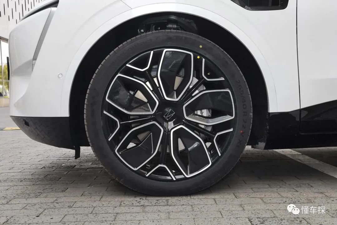 11的侧面修长且厚重,同时C柱上方还使用了溜背式设计。此外,新车还使用了后排隐私玻璃、隐藏式门把手,并且还标配了21英寸花瓣造型轮毂(265/45
