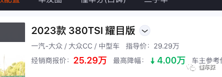 文中提到的大众CC指的是2023款 380TSI 耀目版,其官方指导价为29.29万元,目前市场优惠在4万左右。
