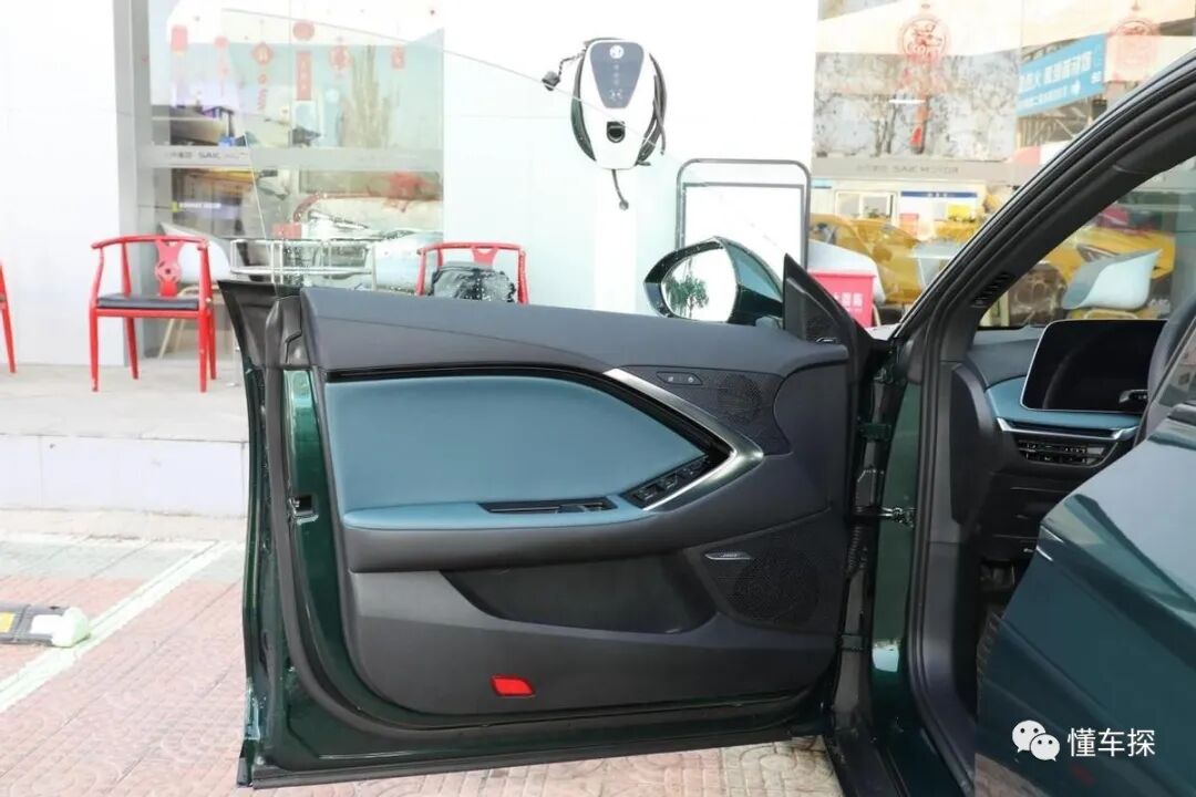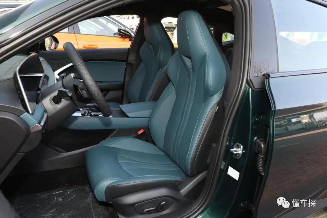 坐进到车内,孔雀绿内饰颜色与外观颜色是比较搭的,镀铬装饰点缀恰到好处,看起来较为协调。