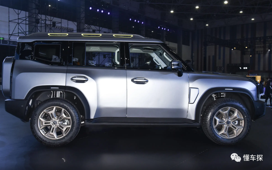 在车身侧面,捷途旅行者使用了大开大合的线条,并且它的离地间隙看起来也挺高,再加上轮毂上方隆起的筋线,气场是真的挺强。