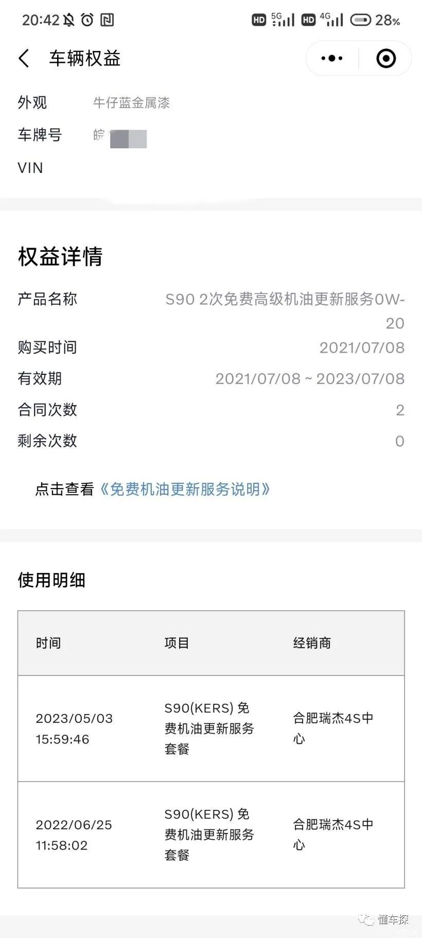 购车刚好赶上厂家活动,赠送两次原厂保养,这个活动当然和现在动辄终生免费保养或者优惠一两万的活动比不了,但是还是有效的让我节省了在4S花钱保养的问题。根据我的了解保养有两种,一种是原厂保养,一种是店保。原厂保养可以在沃尔沃沃世界小程序以及沃尔沃汽车APP中的车辆权益信息中查看。原厂保养标准化的,店保则是五花八门,具体细节要在买车时问清楚。