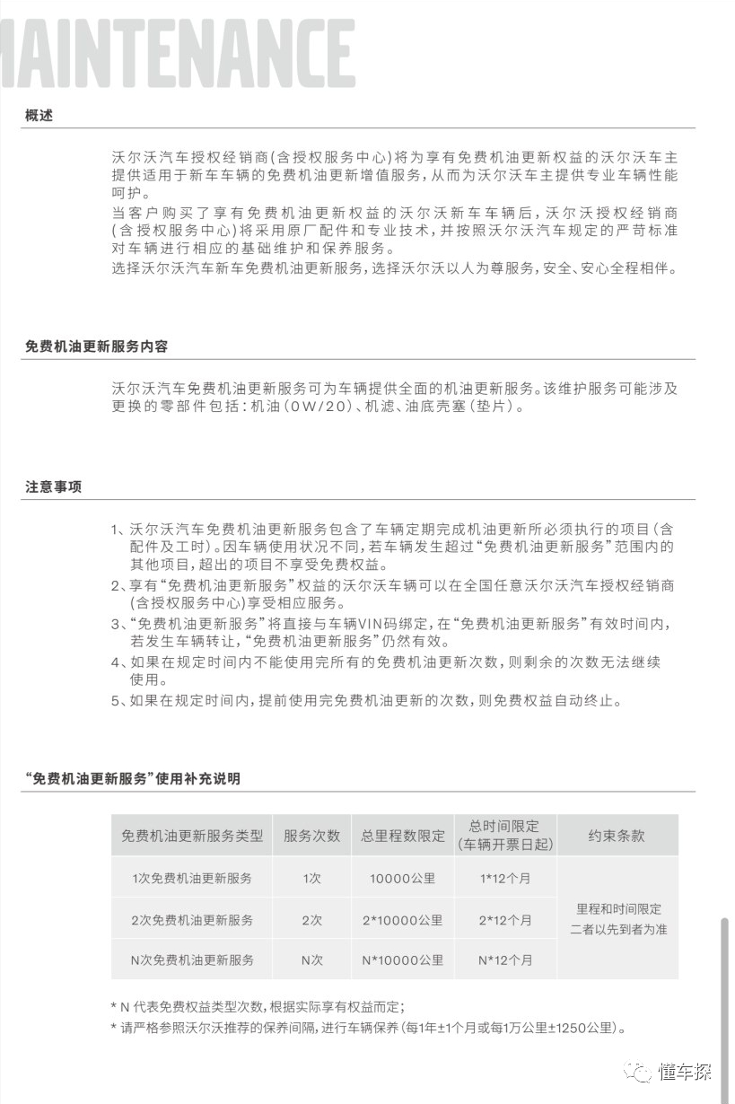 很多新车主刚拿到车没几个月就被通知去4S店保养了,4S还有各种话术哄骗小白车主保养。但是,你就按照厂家的保养手册保养准没错,厂家已经充分考虑到了中国市场的用车环境。不要随意听周围日系车老司机的经验!简单来讲,沃尔沃的车加全合成机油,就是1万公里1年保养一次,先到为准。