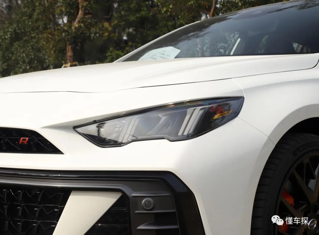 首先在车头部分,传祺影豹2.0T并未沿用1.5T版本的设计,而是采用了分体式的进气格栅,并且在上进气格栅内部还加入了非常醒目的红色字母“R”。