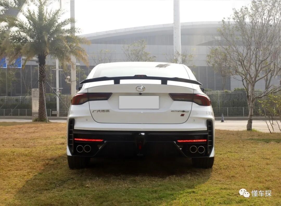 车尾部分,传祺影豹2.0T原厂就带了一个大尾翼,并且在车尾的下方新车还配备了双边四出的排气,所以整个车尾的运动感是呈现得很足的。