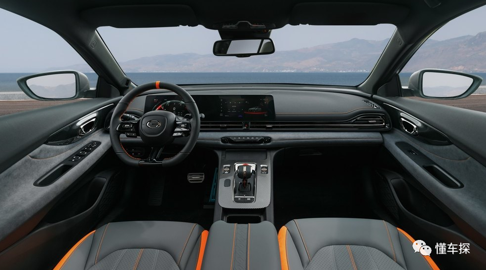 内饰整体运动氛围营造相当到位,大面积灰色翻毛皮与碳纤维纹路饰板搭配精致的做工,让内饰拥有了一定的高级感,同时贯穿式空调出风囗的设计也拓宽了车内视觉空间感。