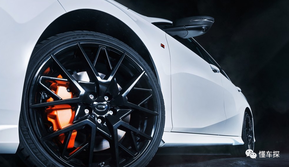 影豹R配备19英寸亮黑色多辐轮圈,原厂轮胎为米其林PS5,规格为245/35R19,内部橙色的四活塞卡钳十分亮眼。