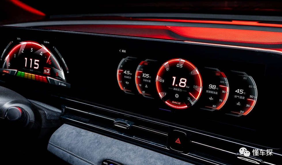 RACE模式下,中控屏会切换为五连表,分别显示涡轮压力、机油压力、水温、变速箱油温以及进气温度,十分硬核。