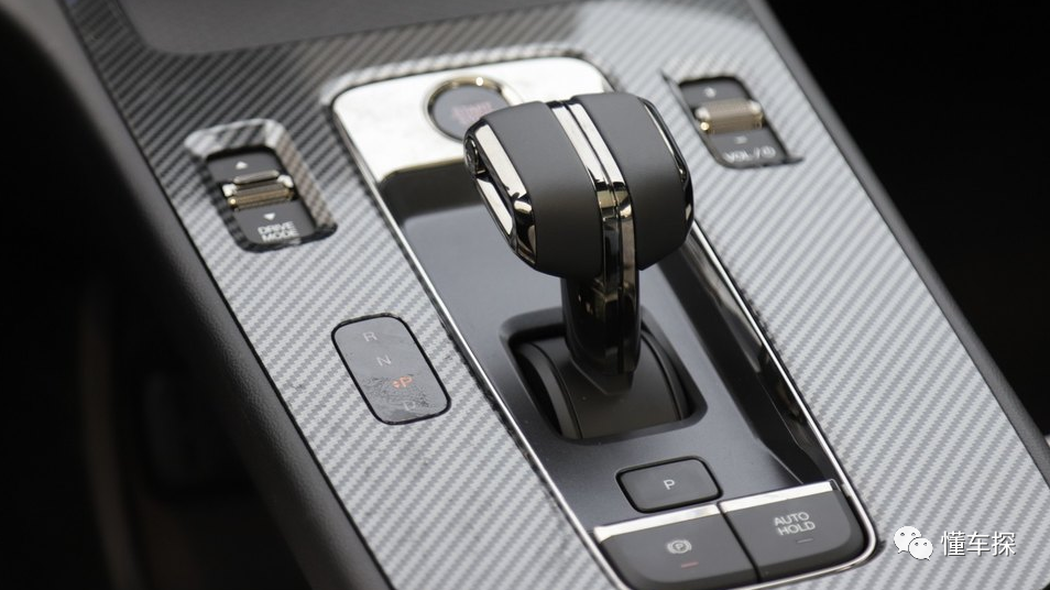 中控换挡杆区域整体被一块亮面碳纤维纹路饰板覆盖,启动按键在换挡杆前方,两侧分别为驾驶模式选择及媒体音量调节按键,整体设计简洁但不失精致感,同时让驾驶者一目了然。
