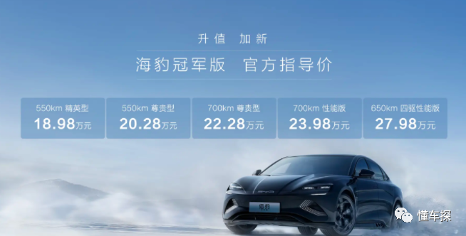 首先我们来看对于每个消费者来说最敏感的部分,那就是它的定价,冠军版海豹的售价区间来到了18.98-27.98万元,相比于2022款车型来说,确实出现了大幅度的调整,同时也摆脱了与特斯拉Model