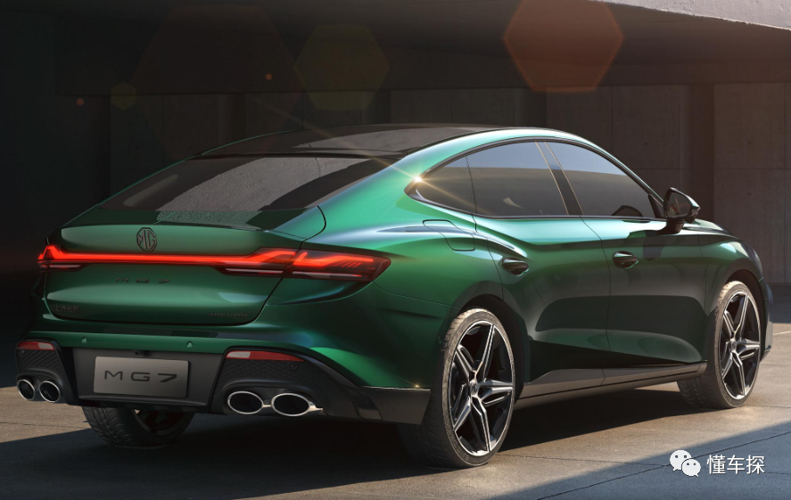 不同于车头和侧身的年轻化设计,MG7的尾部设计似乎更加偏向于性能,其在尾部采用了电动尾翼设计,当车速达到每小时一百公里的时候,尾翼便会自动开开启,同时在后包围处,该车还采用了双边四出的排气布局,在视觉体验上也是直接拉满,并且在配色方面,该车的整个后包围也是采用了黑化处理,在时尚感和精致感上也是有所保障的。