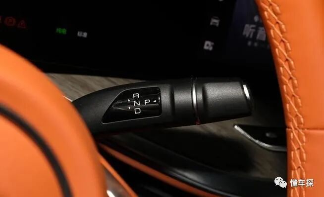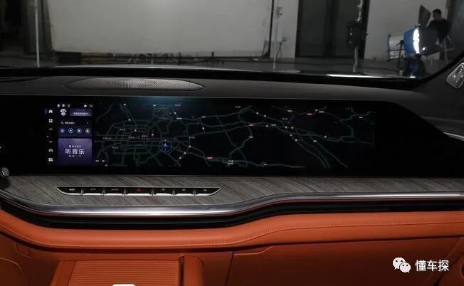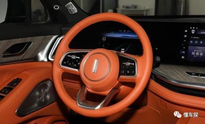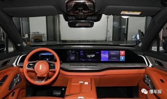 内饰中,和我们预期想到的设计风格完全一致,蓝山DHT-PHEV选择了一条“智能彩电”路线,一体式27英寸三联屏横贯驾驶舱视线中央,辅以黑橙色内饰搭配和局部仿木纹饰板点缀,以及橙色软包材质包覆,内饰整体氛围豪华,符合国人对传统车企设计内饰的豪华认知。
