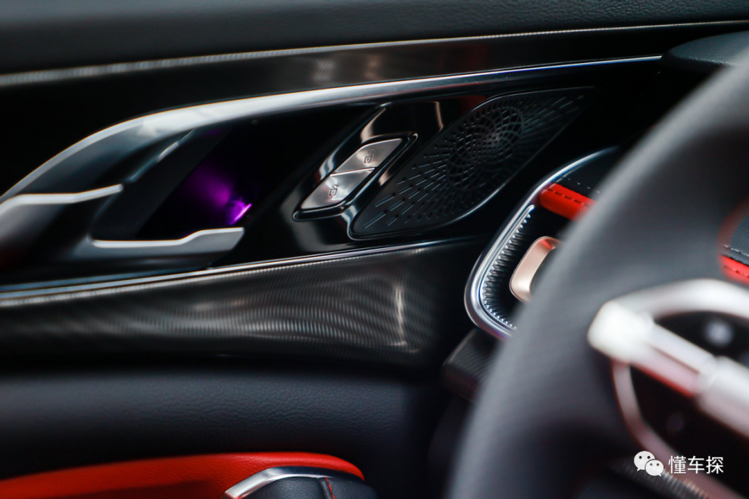 这款车型在座舱内打造出了运动氛围,其中就包含了D型方向盘和碳纤维饰条。